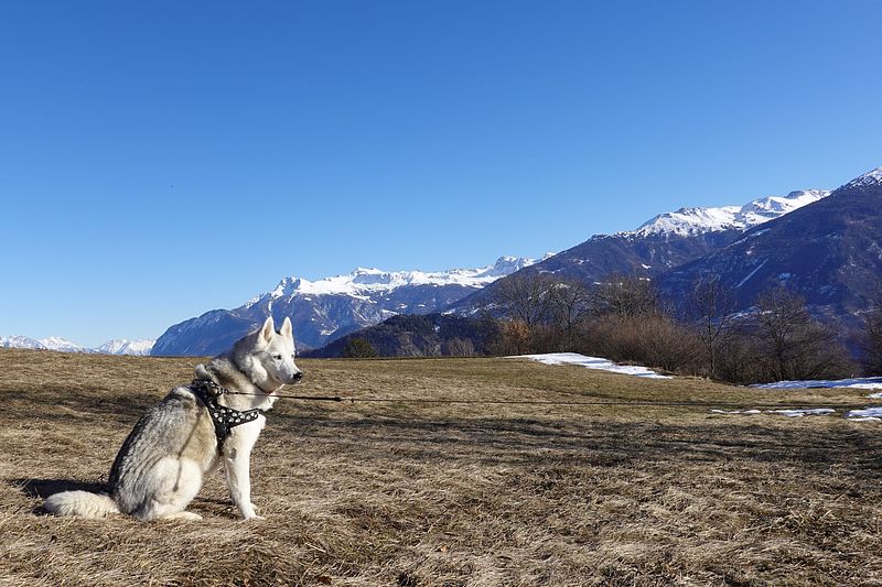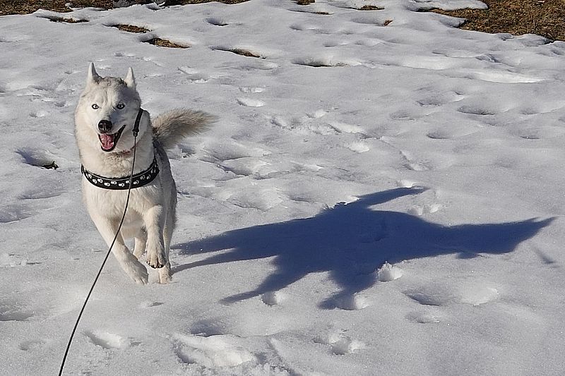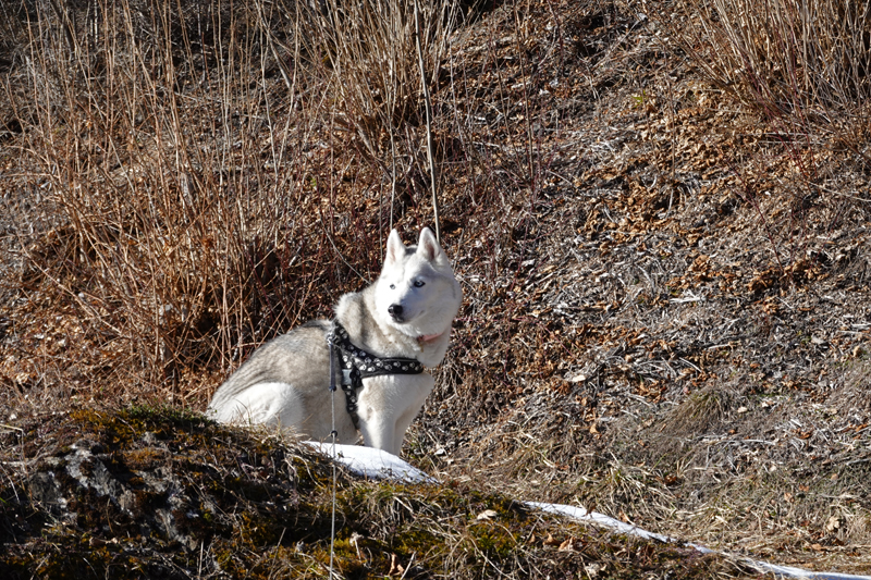 Auch heute gab es wieder strahlendes Wetter und auch heute haben wir nach dem Mittag eine kleine Tour unternommen. Teilweise ging es auf kleinen Wegen und einem Bach entlang, den ich gar noch nicht kenne. Weil die Temperatur am Nachmittag ziemlich über Null Grad lag, war es an viele Orten nass und matschig, meine Füsse und der Bauch wurden da schnell ein bisschen schwarz. Doch einige Schneefelder sind immer noch zu finden, da kann ich mich genüsslich wälzen (und wieder saubere Füsse und Bauch bekommen) oder kann über drauf los rennen (so lang die Leine ist) und mich austoben – wie man auf dem Bild sehen kann. Dazwischen habe ich natürlich auch ein paar Leckerlis bekommen und hin und wieder gab es auch ein paar Pausen, wo meine Menschen die tolle Aussicht geniessen wollten.