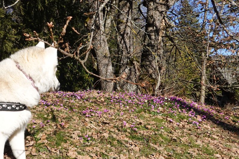 Das Angebot, noch im Garten zu bleiben, nahm ich zwar an, aber ohne grosse Begeisterung. Immerhin bin ich bei den verschiedenen Blumen vorbei gekommen, die hier schon blühen. Auf dem Bild sieht man ganz viele kleine Cyclamen, die da unter der Eiche blühen. Es hat dazu auch schon Schneeglöckchen, Krokusse, Anemonen und Primeln – also ist es eigentlich schon sehr frühlingshaft. Auch die Sonne machte mit, obwohl es etwas mehr Wolken hatte, als in den vergangen Tagen.