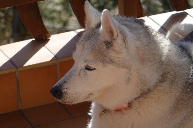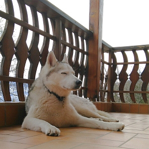 Am Mittag fuhr aber der eine Mensch zum Einkaufen weg, was mir ganz und gar nicht gefiel und mich total unruhig machte. So wollte ich auf den Balkon, dann wieder zurück ins Haus, dann auch in den Garten und ich heulte immer mal wieder rum – so wie Huskys das eben tun. Die Nachmittagsrunde war dann entsprechend kurz, weil ich fast gar nicht zu bewegen war und lieber zu Hause auf die Rückkehr des einen Menschen warten wollte. Was ich dann auf dem Balkon auch länger tat. Auf dem Bild ist ja zu sehen, dass es sonnig war und also ganz angenehm. Die Freude war natürlich riesig, als das Auto zum Haus fuhr und ich den Menschen unten in der Garage freudig begrüssen konnte.