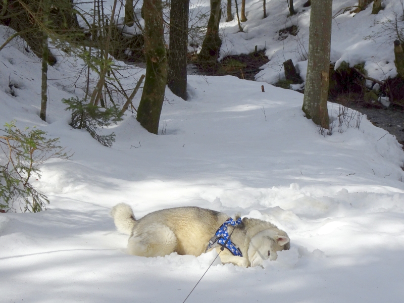 Das Wetter war heute wieder sehr sonnig und die Temperatur stieg auch wieder über 10°C. Ich fühlte mich aber nicht so wirklich in Form für eine weite Wanderung. Auf der Strasse vom Haus weg trippelte ich ziemlich langsam dahin und als das grosse Geschäft gemacht war, meinte ich eigentlich, man könne ja wieder umkehren. Aber ich hatte mich getäuscht, meine Menschen wollten weiter. So bin ich dann gemächlich vorne weg gelaufen, habe hier und dort geschnüffelt und immer mal wieder stehen geblieben.. Erst als es dann auf den Naturweg ging, wo stellenweise immer noch Schnee lag, kam ich dann langsam wieder auf mein normale Geschwindigkeit. Wir sind dann den steilen Weg bei der Felswand hoch gegangen, wo oben bei der kleinen Brücke noch viel Schnee lag. Da konnte ich mich noch einmal so richtig und genüsslich wälzen und wollte gar nicht mehr aufhören damit.