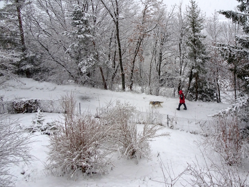Nach einem guten Stück mussten wir dann aber umkehren, die Schlaufe bis zum Teich hinauf war zu tief verschneit und es hatte noch keine Spuren. Da haben sich die Menschen entschlossen, mit mir den selben Weg zurück zu marschieren. Ich hatte nichts dagegen, so konnte ich vom grossen Feld nochmals profitieren und mich austoben. Bei der Rückkehr hatte ich grossen Appetit und wenn ich jetzt zum Fenster raus schaue – es schneit immer noch.