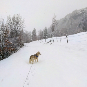 Es schneite dann den ganzen Morgen und auch nach dem Mittag einfach weiter. Wir sind natürlich trotzdem aufgebrochen – mir macht das ja weniger aus, aber die Menschen haben alles Mögliche angezogen – Handschuhe, Mützen, Kapuzen, um vor dem Schneefall geschützt zu sein. Ich habe etwas später auf dem Weg ins Nachbardorf wieder ein neues grosses Feld entdeckt, wo ich im hohen Schnee und durch die ganz weissen Landschaft rennen konnte. Auch da waren wir fast alleine unterwegs.