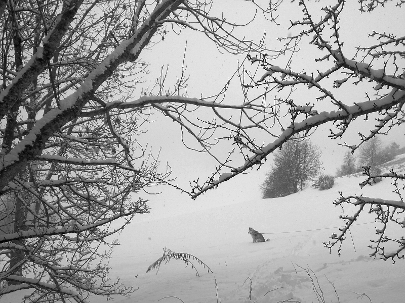 Es ist ja fast unglaublich, jetzt bin ich schon eine Woche in den Ferien und auch heute morgen hatte es wieder Neuschnee. Ich konnte beim Morgenspaziergang mit meinem Menschen auf der völlig verschneiten Strasse marschieren. Wir waren offenbar um halb acht die ersten und haben ganz neue Spuren in den Schnee gestampft. Autos oder laute und stinkende Mofas oder andere Leute hatte es noch gar keine. Von weitem haben wir aber dann doch noch einen der vielen Nachbarhunde, einen deutschen Schäfer, entdeckt. Dieser rannte über ein grosses weisses Feld. Aber er hat uns leider nicht gesehen und so setzte ich mich vergebens länger in den Schnee und beobachtete die Szene von oben.