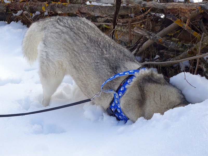 Auf dem Rückweg beim Fussballfeld hörten wir schon von weitem ein wildes Gebell eines Hundes. Es kam dann immer näher und ich musste still stehen und genau beobachten und hinhören. Mein Mensch meinte, es könnte ein Jagdhund sein, der irgendwo in der Nähe eine Spur verfolgen würde. Die Laute kamen immer näher und mein Mensch nahm mich ganz kurz an die Leine. Und plötzlich tauchte vom Feld unten ein Reh auf, überquerte mit hohen und weiten Sprüngen unseren Weg und verschwand oben wieder im Wald. Ein paar Sekunden später folgte der bellende Jagdhund. Es schien, dass er schon etwas älter wäre und langsam ausser Atem kommen würde. Aber er folgte unbeirrt der Spur laut hinterher. Mich machte diese ganze Szene etwas "chribelig" und ich musste noch lange hinterher schauen und wieder sitzen bleiben, bis ich dann wieder weiter marschieren konnte. Aber beim groben Holzzaun beim Abstieg vom Wald musste ich doch meine Nase in den Schnee stecken, weil sich dort etwas bewegte – meinte ich jedenfalls. Ich suchte länger, aber letztlich fand ich halt doch nichts – vielleicht auch besser so.