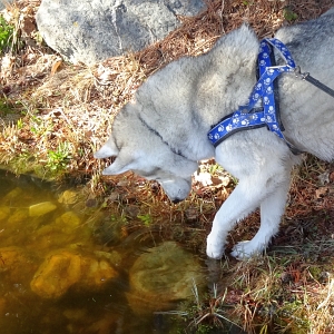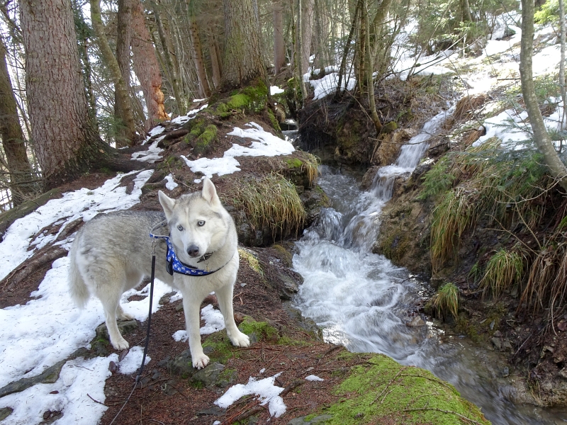 Heute habe ich mit meinen Menschen nochmals einen neuen Weg entdeckt. Wir sind zunächst den Wanderweg hinauf gestiegen bis zu einem grossen Weiher. Der ist noch immer ganz zugefroren und auf dem Rundweg liegt noch sehr viel Schnee, wir gaben es dann auf, rund herum zu wandern. So sind wir weiter hinauf gewandert bis zur einer Suone, einem Bewässerungskanal, von denen es in dieser Gegend ganz viele gibt. Bei diesem hier ist besonders, dass er das ganze Jahr über Wasser führt und jetzt mit der Schneeschmelze besonders viel. Entlang des schmalen Weges mit den vielen Wurzeln rauschte es überall. An der Stelle, wo die Suone den breiteren Weg kreuzt, sind wir dann diesem gefolgt. Dort habe ich die Route wieder erkannt, weil wir da auch schon waren. Es war ziemlich nass und etwas matschig und meine Beine und mein Bauch waren bald mehr braun als weiss. Hier haben wir einen Schäferhund angetroffen und ich konnten ein bisschen spielen. Aber da meine Menschen mich ja nicht von der Leine lassen können, war das halt nur ein kurzer Moment.